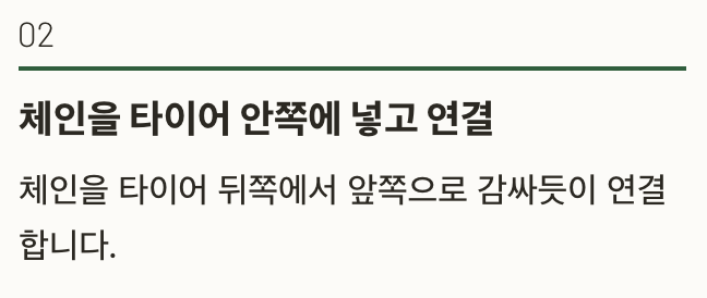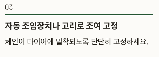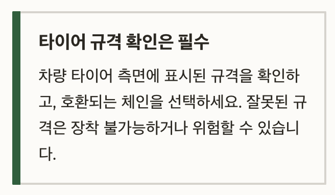 | 사슬형 | 접지력 최강, 가격 저렴 | 소음 큼, 장착 어려움 | 트럭, SUV, 산악도로 |