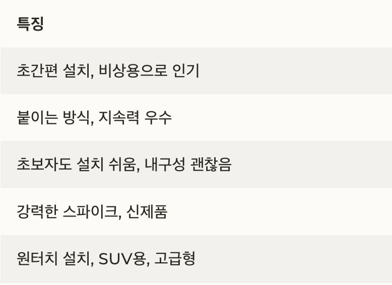 | 스파이더형 | 원터치 설치, SUV 호환성 좋음 | 가격 비쌈, 어댑터 설치 번거로움 | 눈 많이 오는 지역, 고급 차량 |