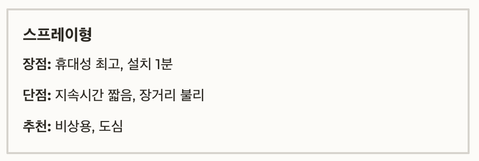| 스프레이형 | 휴대성 최고, 설치 1분 | 지속시간 짧음, 장거리 불리 | 비상용, 도심 |