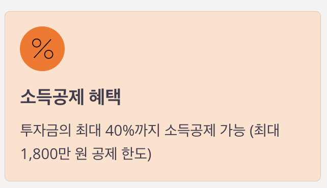 투자금의 최대 40%까지 소득공제 가능 (최대 1,800만 원 공제 한도) - 분리과세 적용