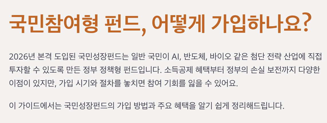 2026년 본격 도입된 국민성장펀드는 일반 국민이 AI, 반도체, 바이오 같은 첨단 전략 산업에 직접 투자할 수 있도록 만든 정부 정책형 펀드입니다. 소득공제 혜택부터 정부의 손실 보전까지 다양한 이점이 있지만, 가입 시기와 절차를 놓치면 참여 기회를 잃을 수 있어요. 이 글에서는 국민성장펀드의 가입 방법과 주요 혜택을 알기 쉽게 정리해드릴게요.