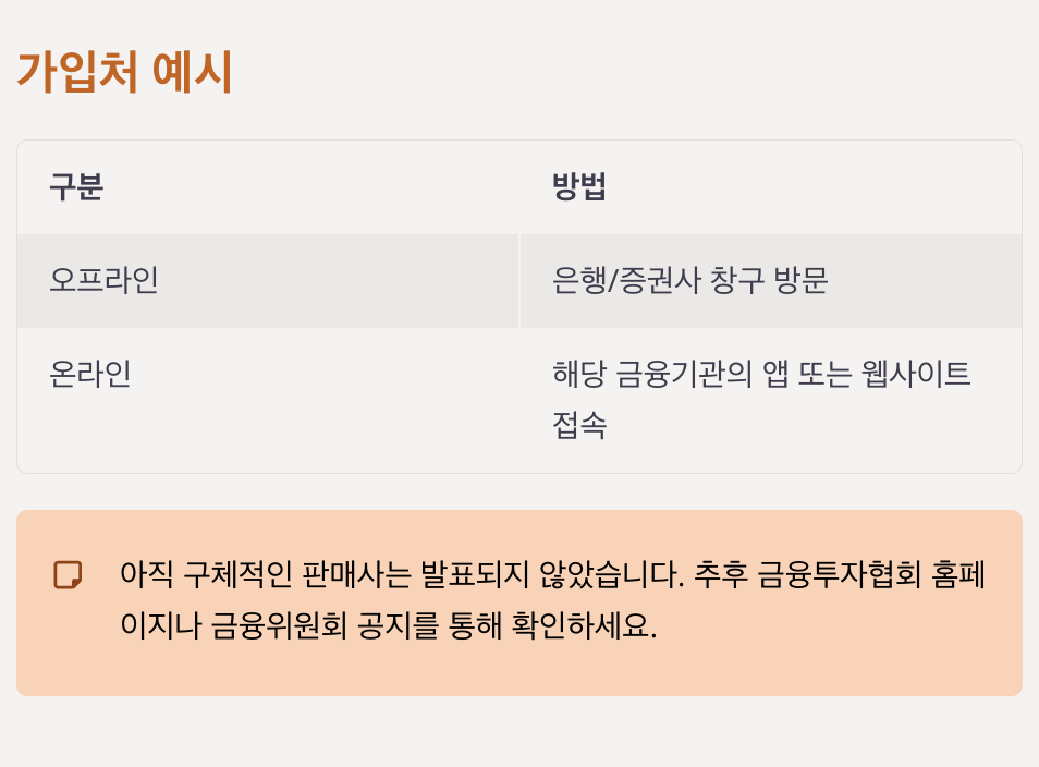 ※ 아직 구체적인 판매사는 발표되지 않았습니다. 추후 금융투자협회 홈페이지나 금융위원회 공지를 통해 확인하세요.