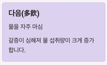 | 다음(多飮) | 물을 자주 마심 | 갈증이 심해져 물 섭취량 증가 |