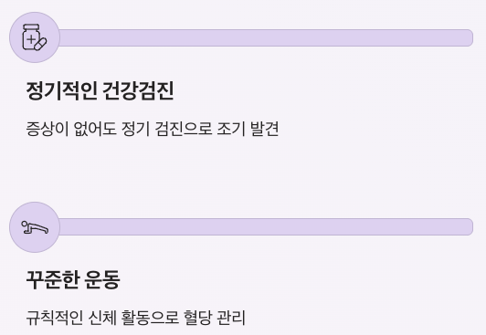 당뇨병은 갑자기 생기는 질환이 아니라, 오랜 시간에 걸쳐 서서히 진행됩니다. 따라서 다음과 같은 습관이 중요합니다.