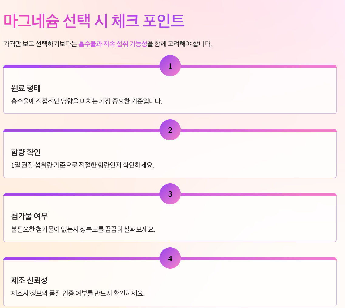 마그네슘 제품을 고를 때는 다음 기준을 확인하는 것이 좋습니다.