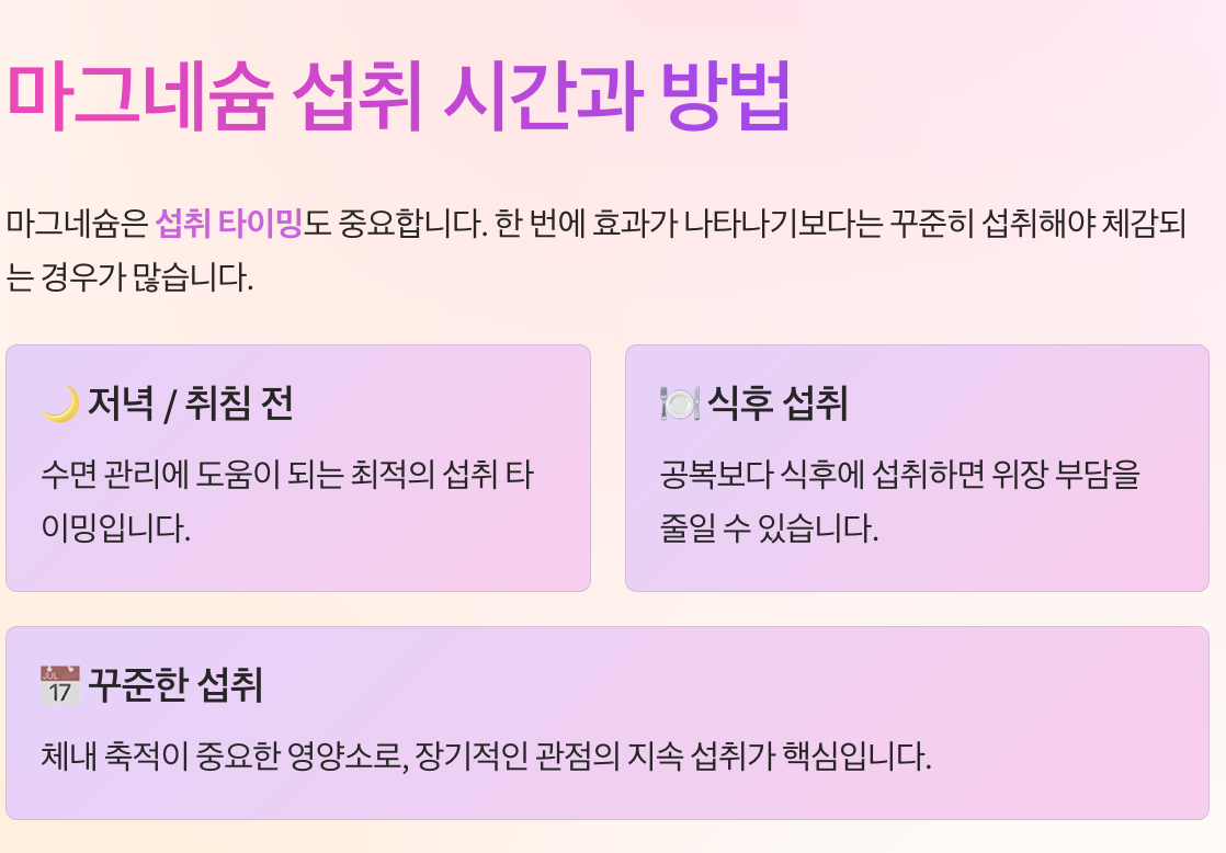 | 킬레이트 마그네슘 | 흡수율 높고 위장 부담 적음 | 장기 섭취 목적 |
