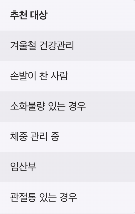 | 혈액순환 개선 | 수족냉증 완화 | 몸을 따뜻하게 함 | 손발이 찬 사람 |