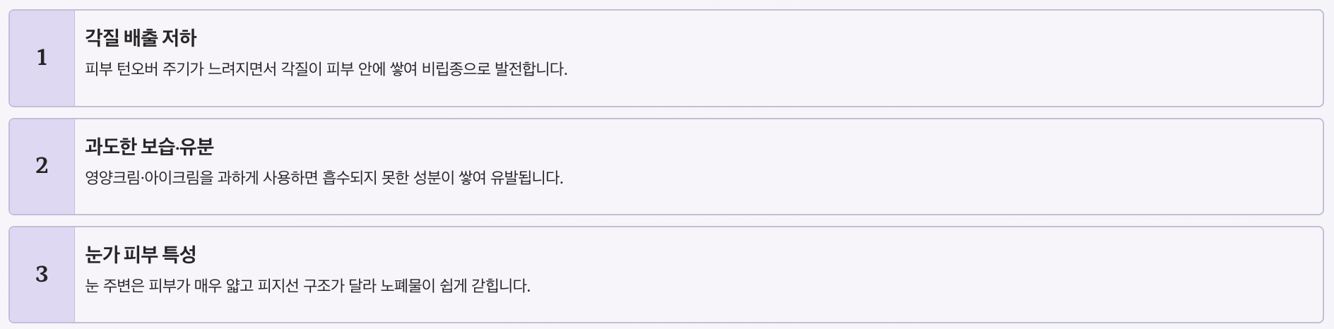 피부의 턴오버 주기가 느려지면서 각질이 제대로 떨어지지 않으면 피부 안에 쌓이게 됩니다. 이 각질이 뭉쳐 비립종으로 발전할 수 있습니다.