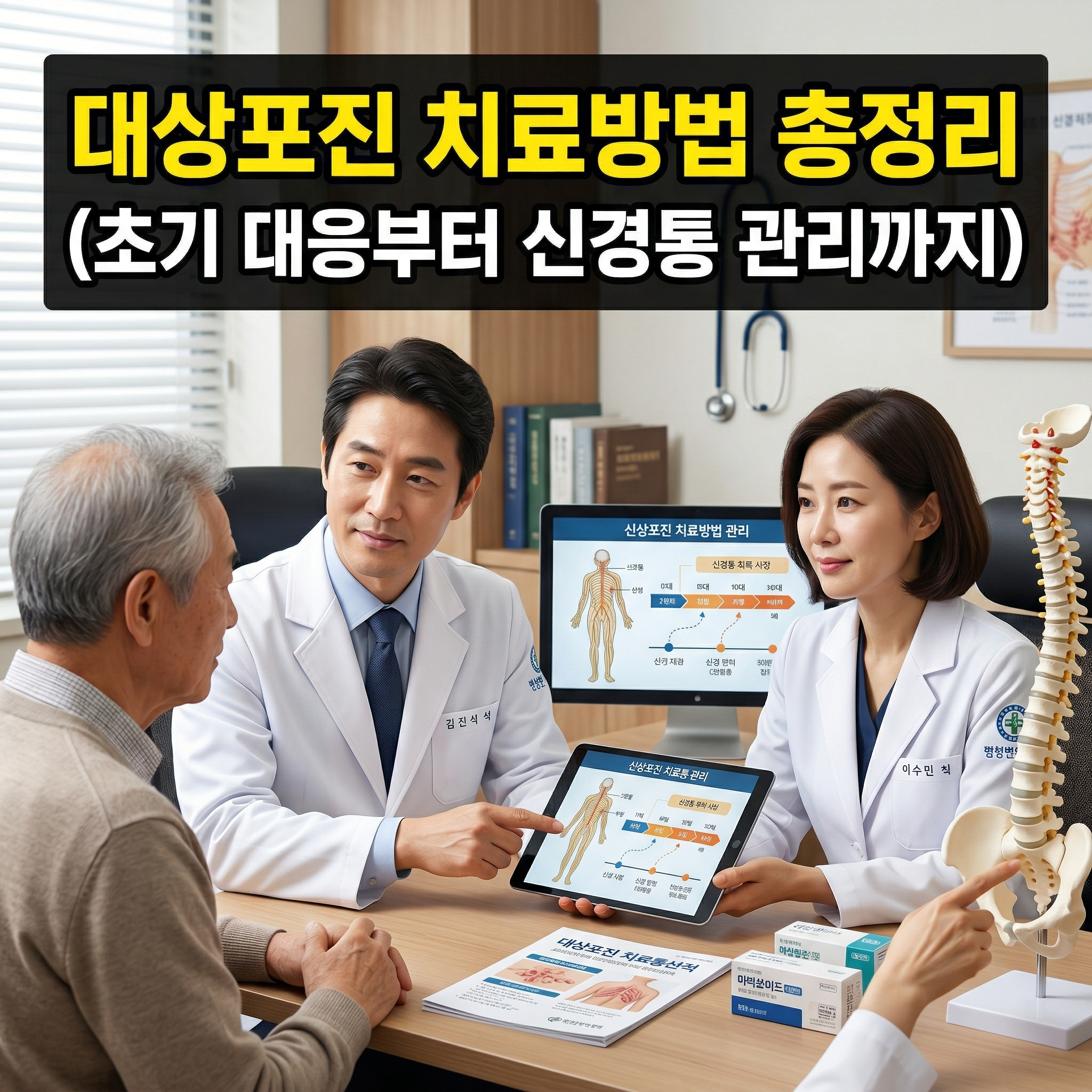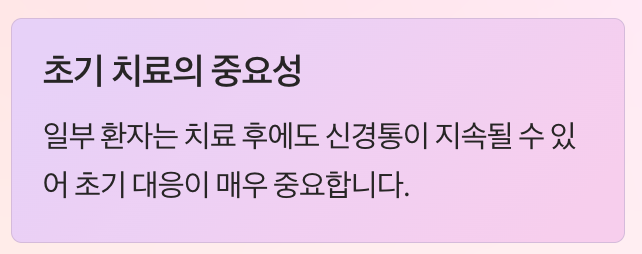 통증이 심한 경우에는 신경통 치료제나 추가 진통제를 병행하기도 합니다. 일부 환자는 치료 이후에도 통증이 지속되는 신경통을 경험할 수 있기 때문에 초기 치료가 매우 중요합니다.