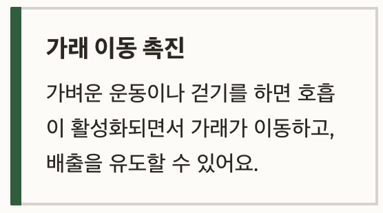 움직이지 않고 가만히 있으면 가래가 흉부에 그대로 쌓일 수 있습니다. 반대로 가벼운 운동이나 걷기를 하면 호흡이 활성화되면서 가래가 이동하고, 배출을 유도할 수 있어요. 가볍게 땀나는 정도의 운동이 적당합니다.