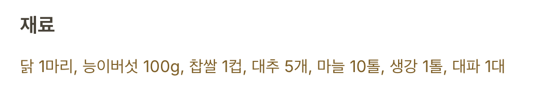 재료: 닭 1마리, 능이버섯 100g, 찹쌀 1컵, 대추 5개, 마늘 10톨, 생강 1톨, 대파 1대