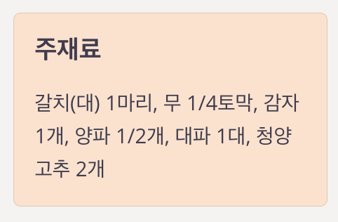 | 주재료 | 갈치(대) 1마리, 무 1/4토막, 감자 1개, 양파 1/2개, 대파 1대, 청양고추 2개 |