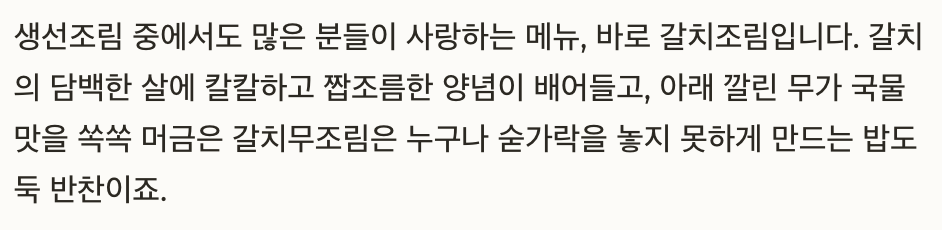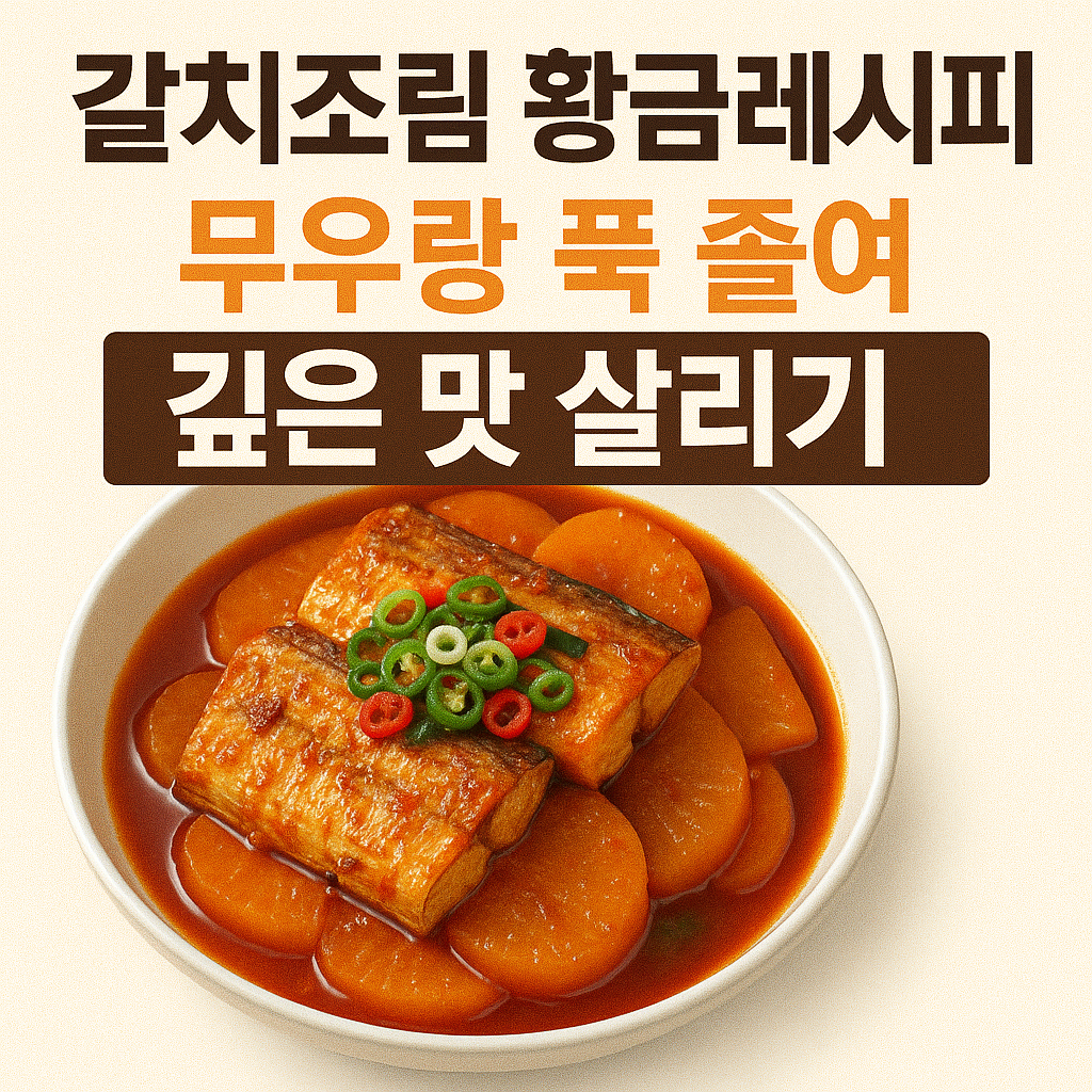 생선조림 중에서도 많은 분들이 사랑하는 메뉴, 바로 갈치조림입니다. 특히 갈치의 담백한 살에 칼칼하고 짭조름한 양념이 배어들고, 아래 깔린 무가 국물맛을 쏙쏙 머금은 갈치무조림은 누구나 숟가락을 놓지 못하게 만드는 밥도둑 반찬이죠. 오늘은 집에서도 실패 없이 만들 수 있는 갈치조림 황금레시피를 소개해 드릴게요. 된장을 살짝 넣은 양념장이 구수한 맛을 살리고, 무는 부드럽고 달큰하게 익어 조림 맛을 극대화해줍니다.