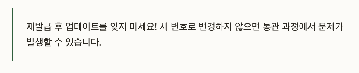 | 재발급하면 예전 번호는 어떻게 되나요? | 즉시 사용 불가능해지고, 새 번호로만 통관됩니다 |