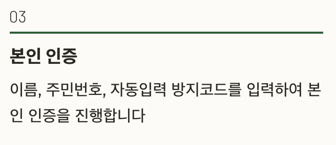 | 3단계 | 이름·주민번호·자동입력 방지코드 입력 후 본인 인증 |