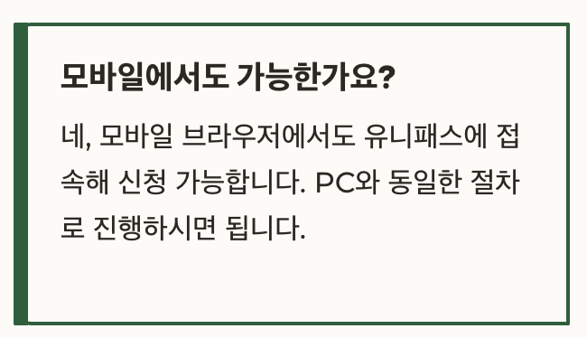 | 모바일에서도 가능한가요? | 네, 모바일 브라우저에서도 유니패스 접속해 신청 가능해요 |