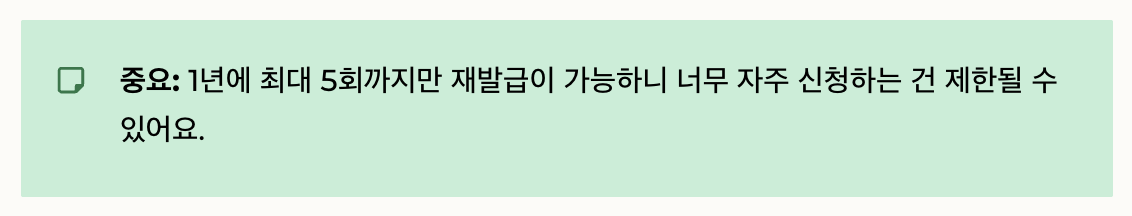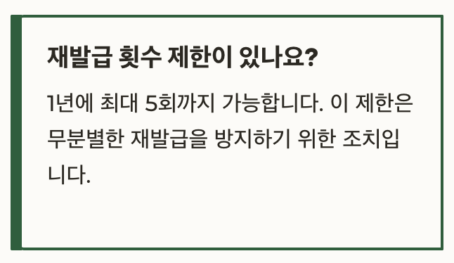 | 재발급 횟수 제한이 있나요? | 1년에 최대 5회까지 가능해요 |