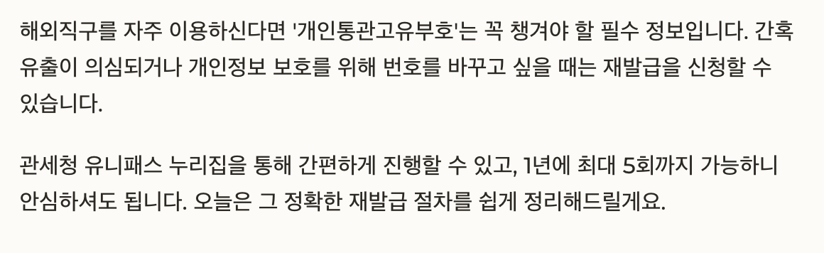 해외직구를 자주 이용하신다면 '개인통관고유부호'는 꼭 챙겨야 할 필수 정보인데요. 간혹 유출이 의심되거나 개인정보 보호를 위해 번호를 바꾸고 싶을 때는 재발급을 신청할 수 있습니다. 관세청 유니패스 누리집을 통해 간편하게 진행할 수 있고, 1년에 최대 5회까지 가능하니 안심하셔도 됩니다. 오늘은 그 정확한 재발급 절차를 쉽게 정리해드릴게요.