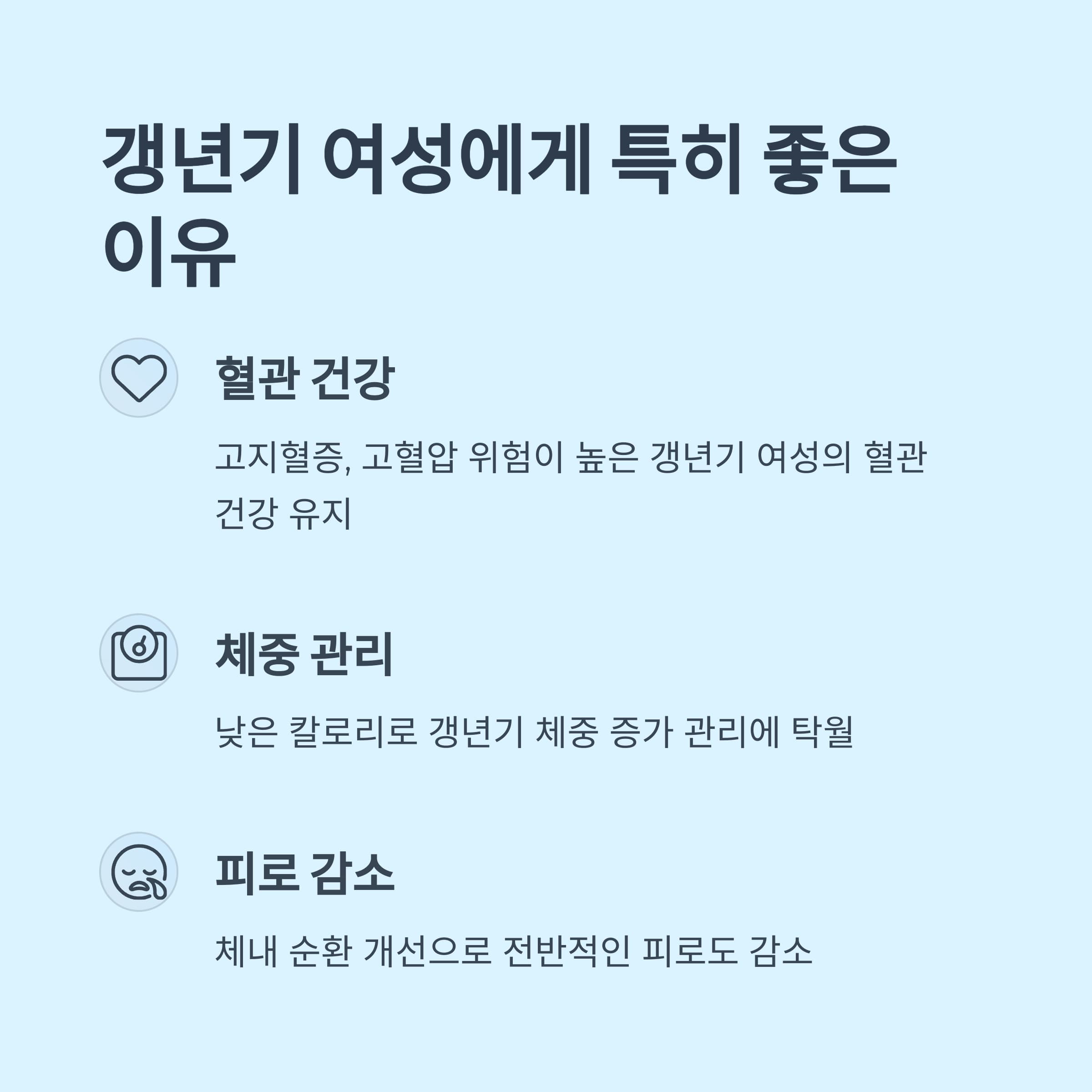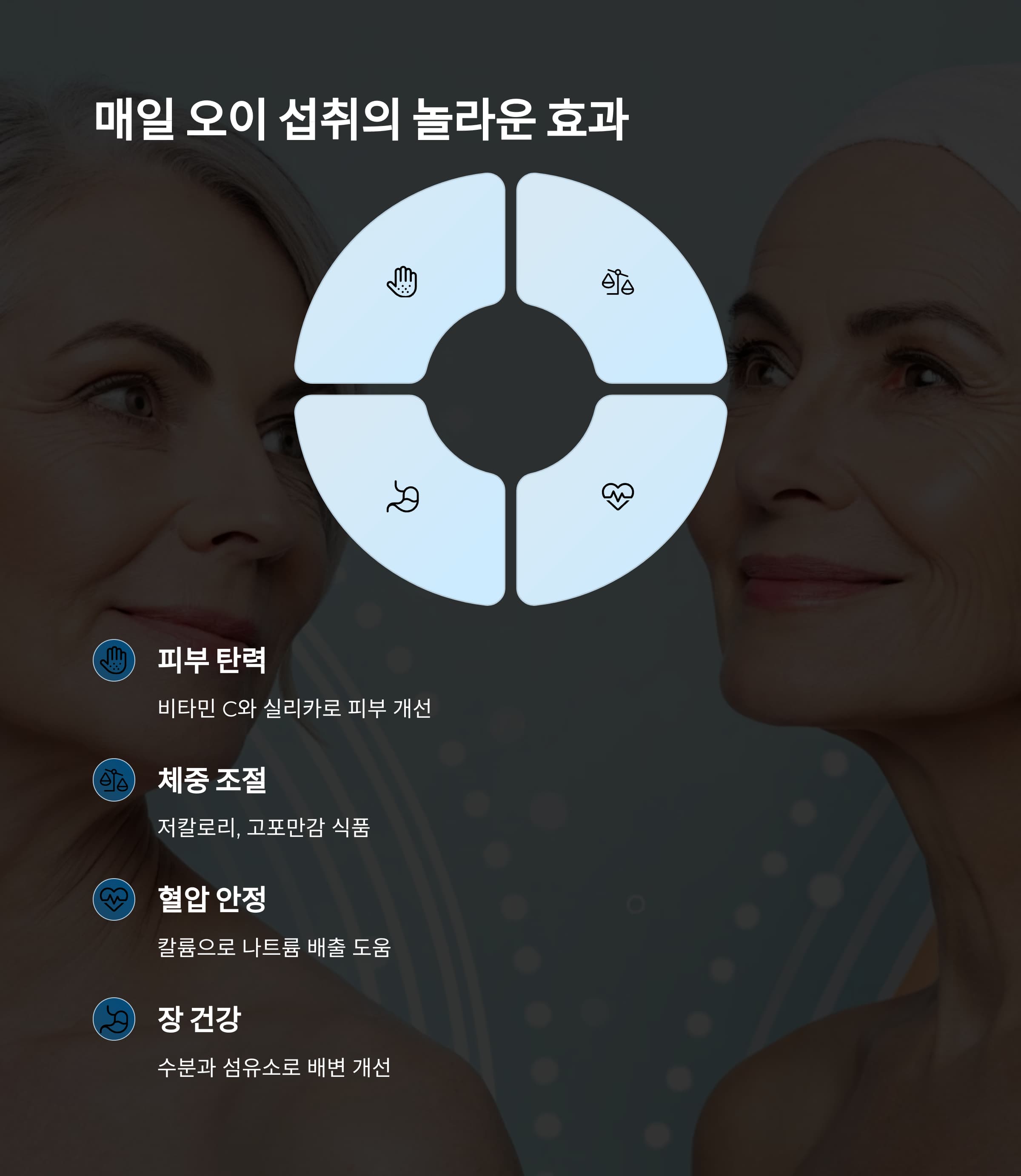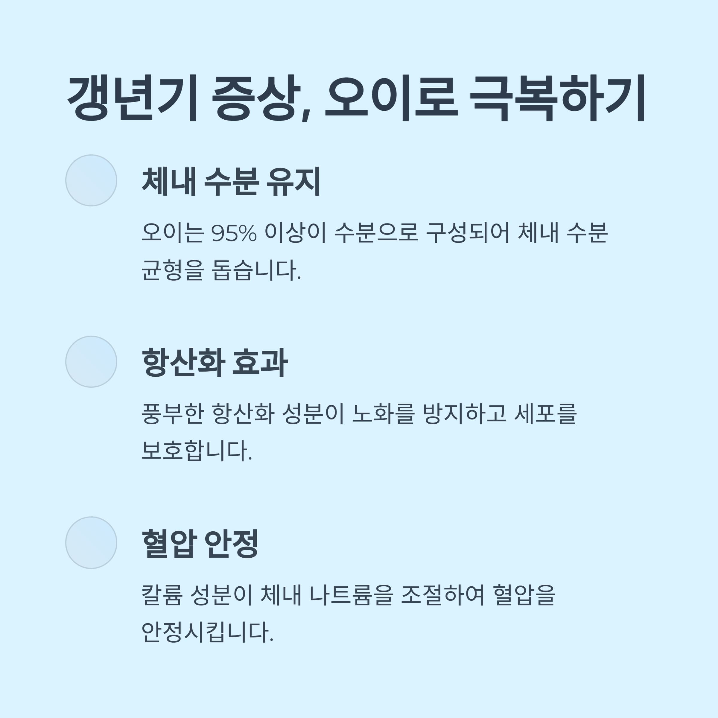 중요: 오이는 특히 고지혈증, 고혈압 위험이 높은 갱년기 여성의 혈관 건강 유지에 도움을 줍니다.