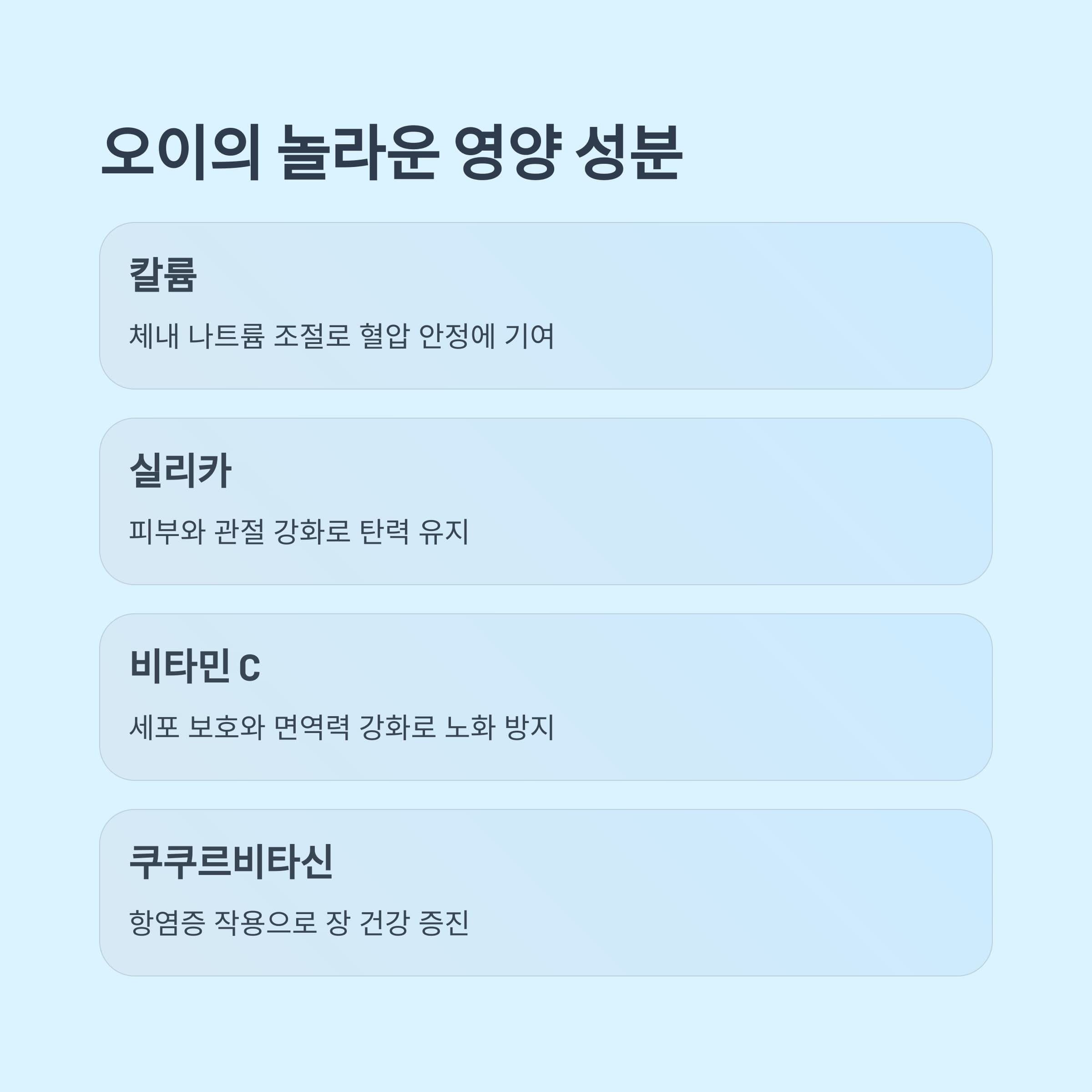오이는 체내 수분 유지, 항산화 효과, 혈압 안정에 기여하는 핵심 채소로 주목받고 있습니다.