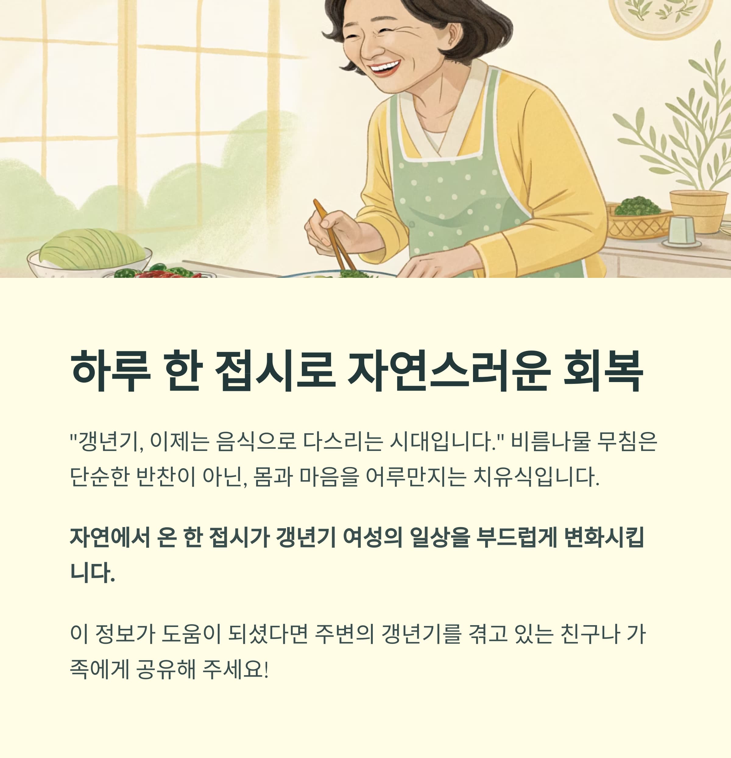 | 중년 갱년기 건강 밥상 🌿 향긋한 취나물 무침으로 봄 기운 충전하기 (2) | 2025.06.09 |