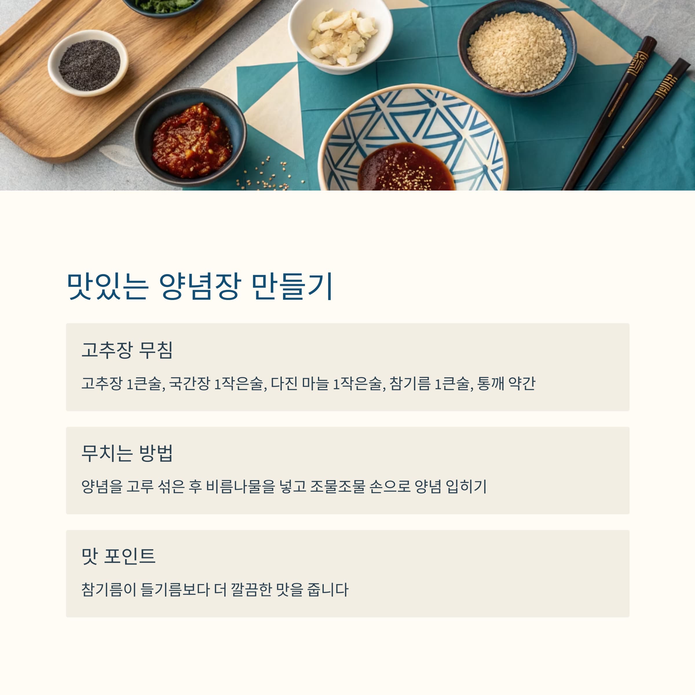 | 참기름 | 1큰술 | 고소한 풍미 |