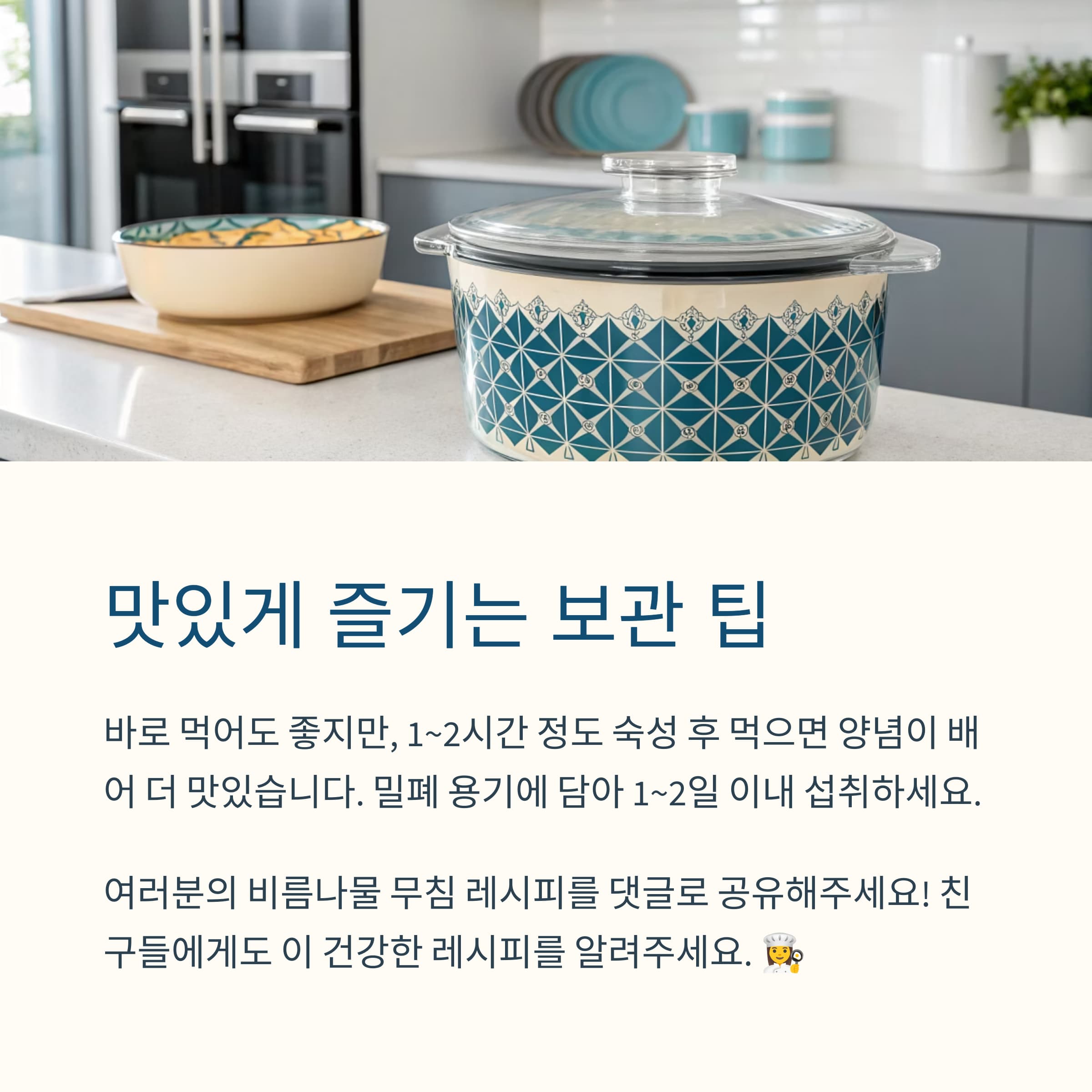 비름나물 무침은 바로 먹어도 좋지만, 1~2시간 정도 숙성 후 먹으면 양념이 배어 더 맛있습니다