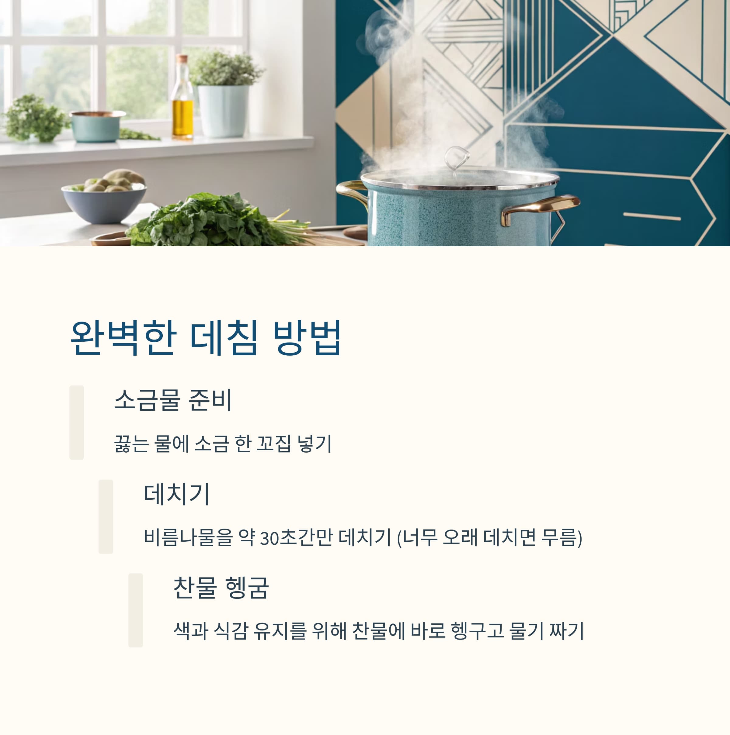 데친 후에는 찬물에 바로 헹궈 색과 식감을 유지하는 것이 포인트입니다