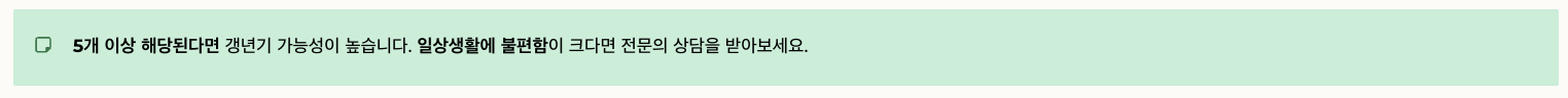 5개 이상 해당된다면 갱년기 가능성이 높습니다.