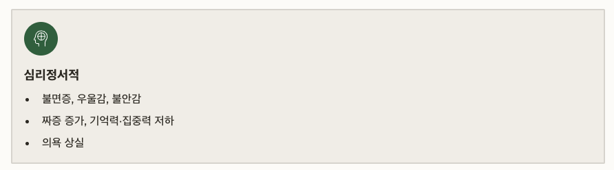 | 2. 심리정서적 | 불면증 | 잠들기 어렵거나 자주 깨는 증상 |