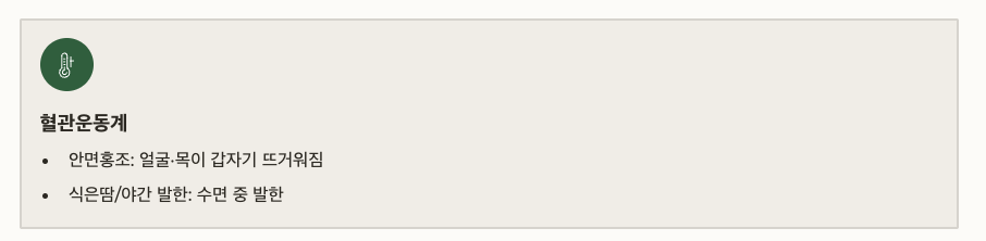 | 1. 혈관운동계 | 안면홍조 | 얼굴·목 부위가 갑자기 뜨거워지고 땀이 흐름 |
