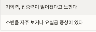 | 기억력 저하 | 단기 기억력 약화, 말이 막히는 느낌 | |