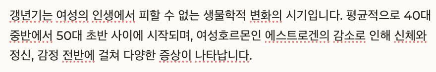 갱년기는 누구에게나 찾아오는 시기지만, 개인의 라이프스타일이나 건강 상태에 따라 그 강도와 지속 기간은 천차만별입니다. 증상이 가볍더라도 몸과 마음이 보내는 변화의 신호를 무시하지 않는 것이 가장 중요합니다.