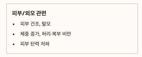 | 5. 피부/외모 관련 | 피부 건조 | 푸석푸석하고 각질 증가 |