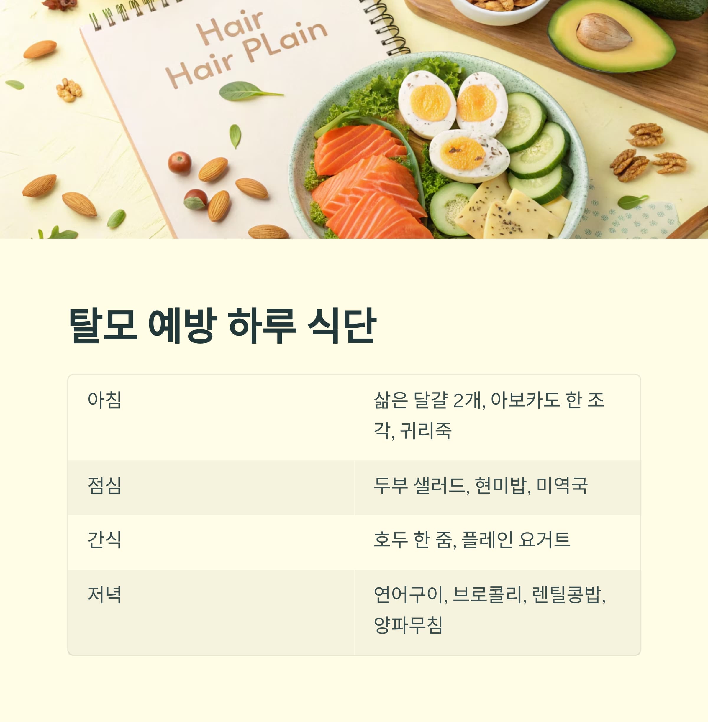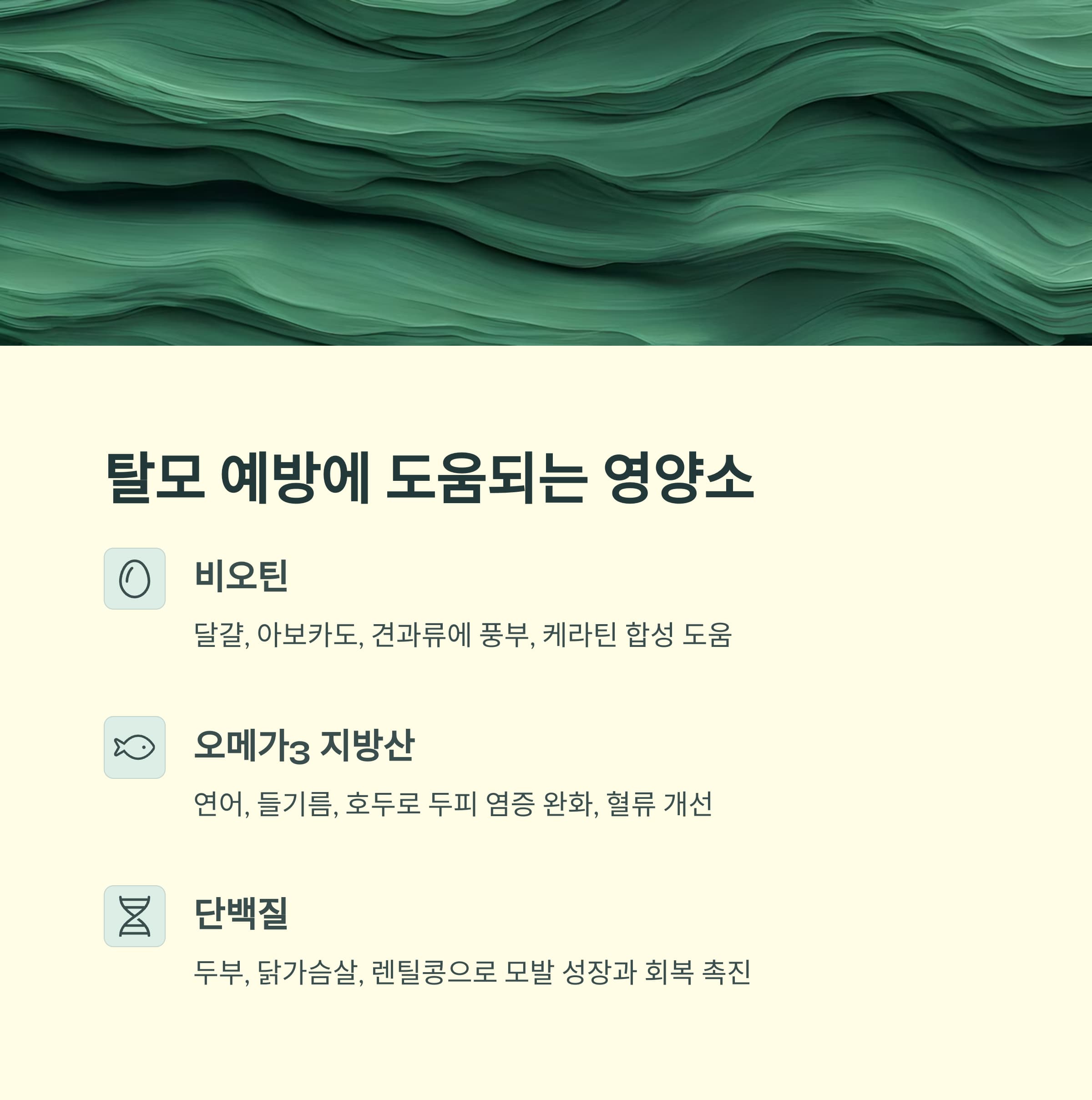 탈모 예방을 위한 식습관의 핵심은 모발 성장에 직접 작용하는 영양소를 충분히 섭취하는 것입니다.