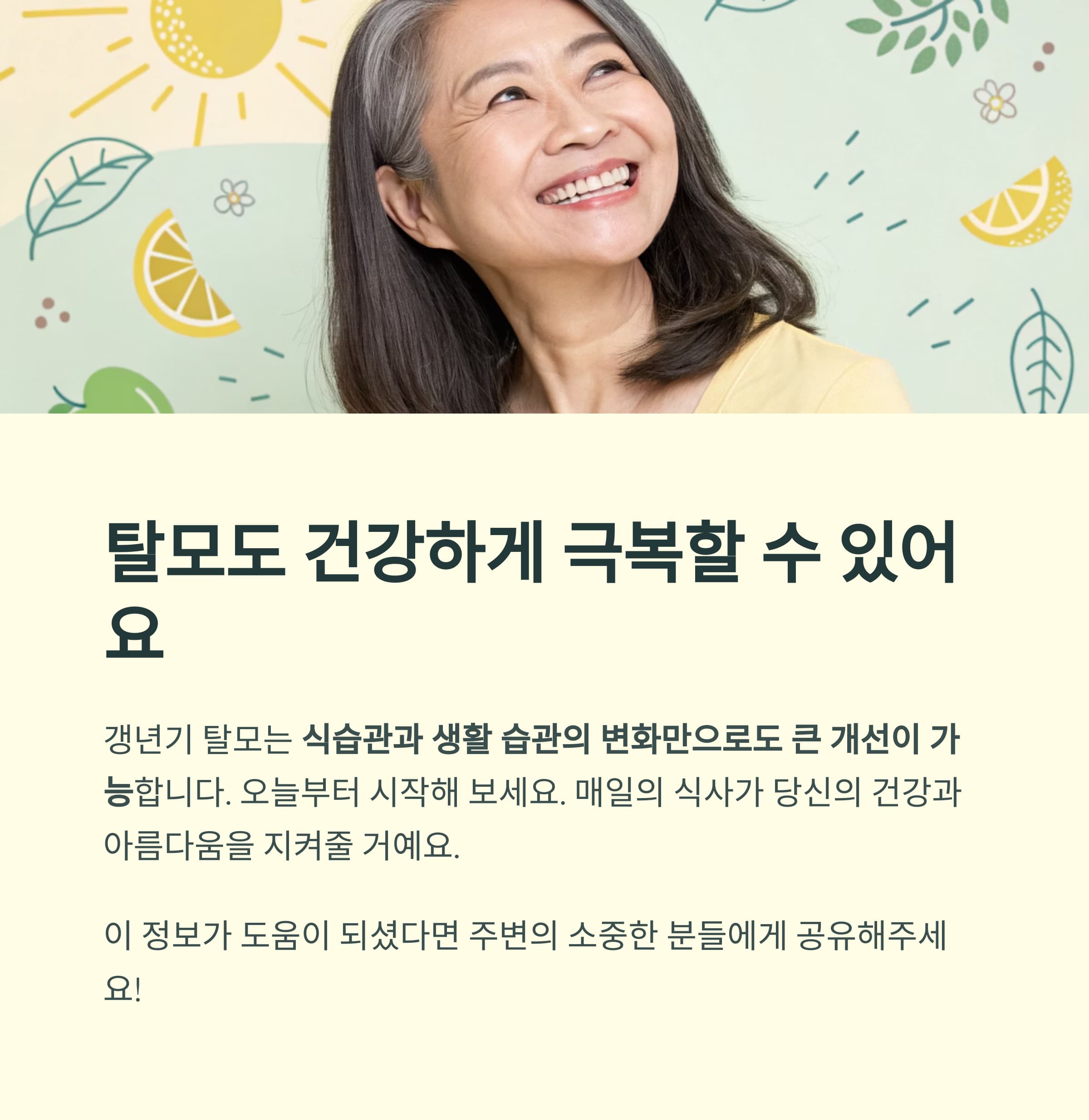 이런 습관은 모발뿐 아니라 전반적인 갱년기 건강 관리에도 큰 도움이 됩니다.