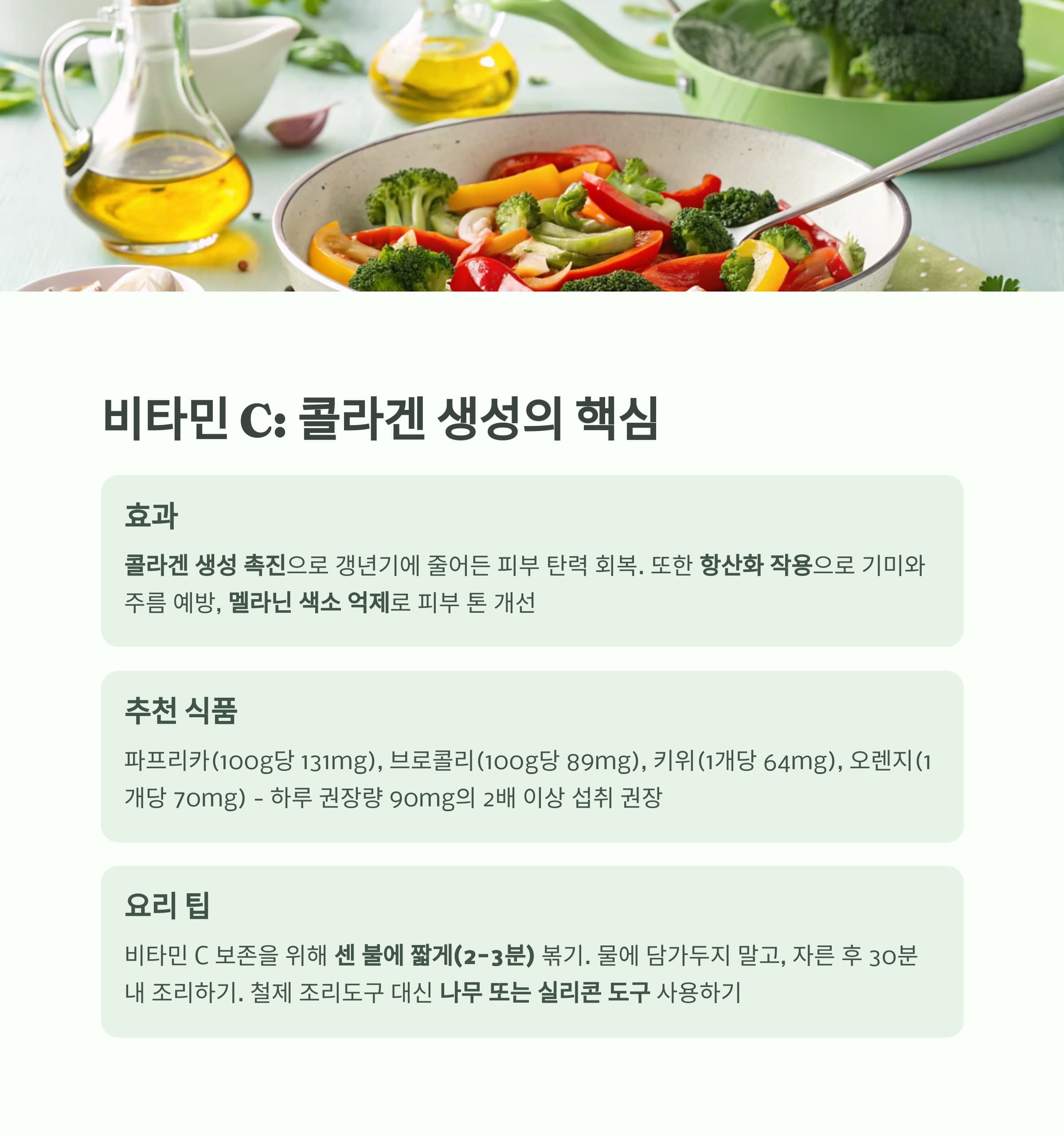 비타민 C는 피부 속 콜라겐 생성을 촉진하고 탄력을 유지하는 데 꼭 필요해요