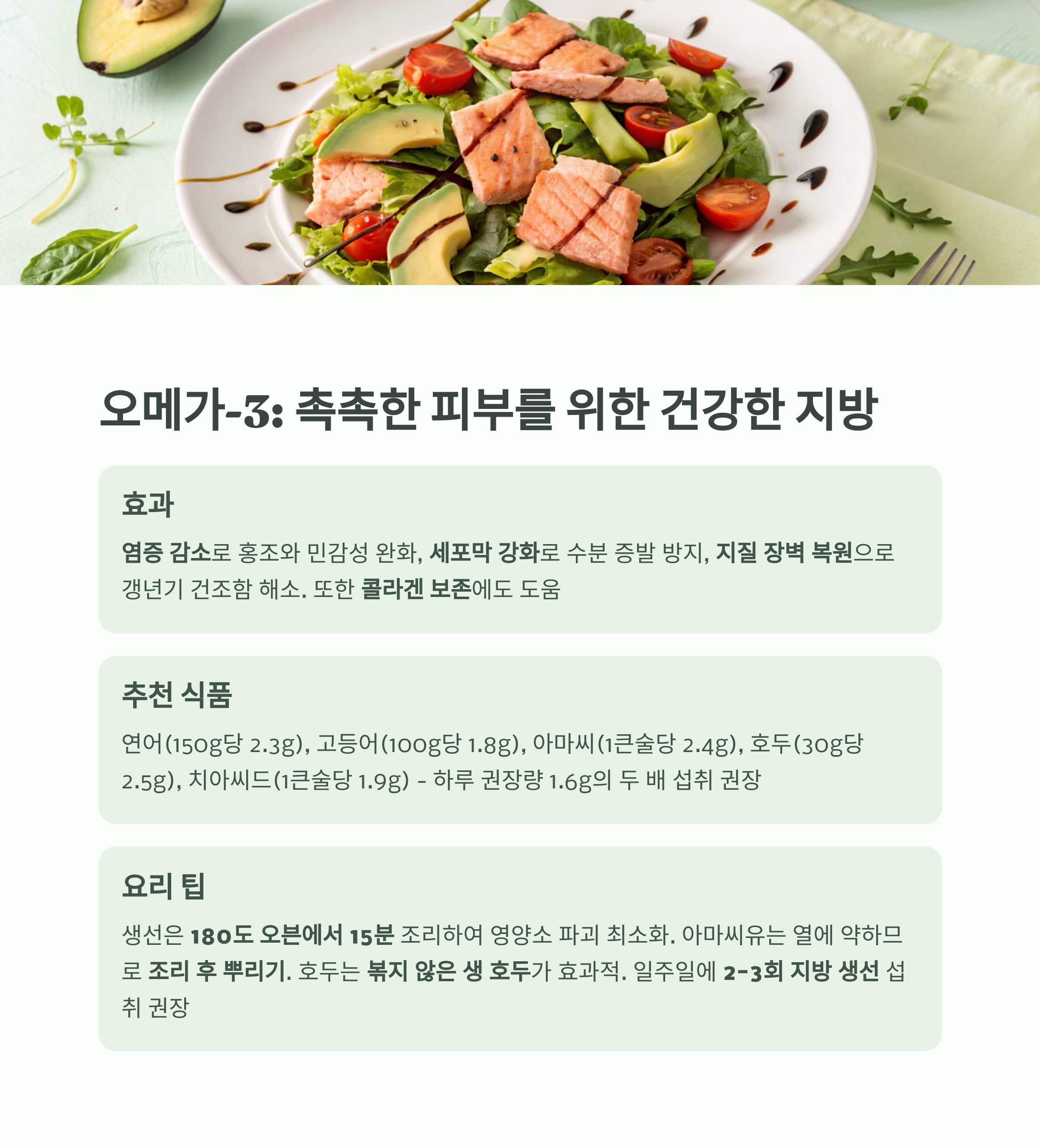 오메가-3는 피부 속 염증을 줄이고 보습력을 높여주는 필수 지방산이에요