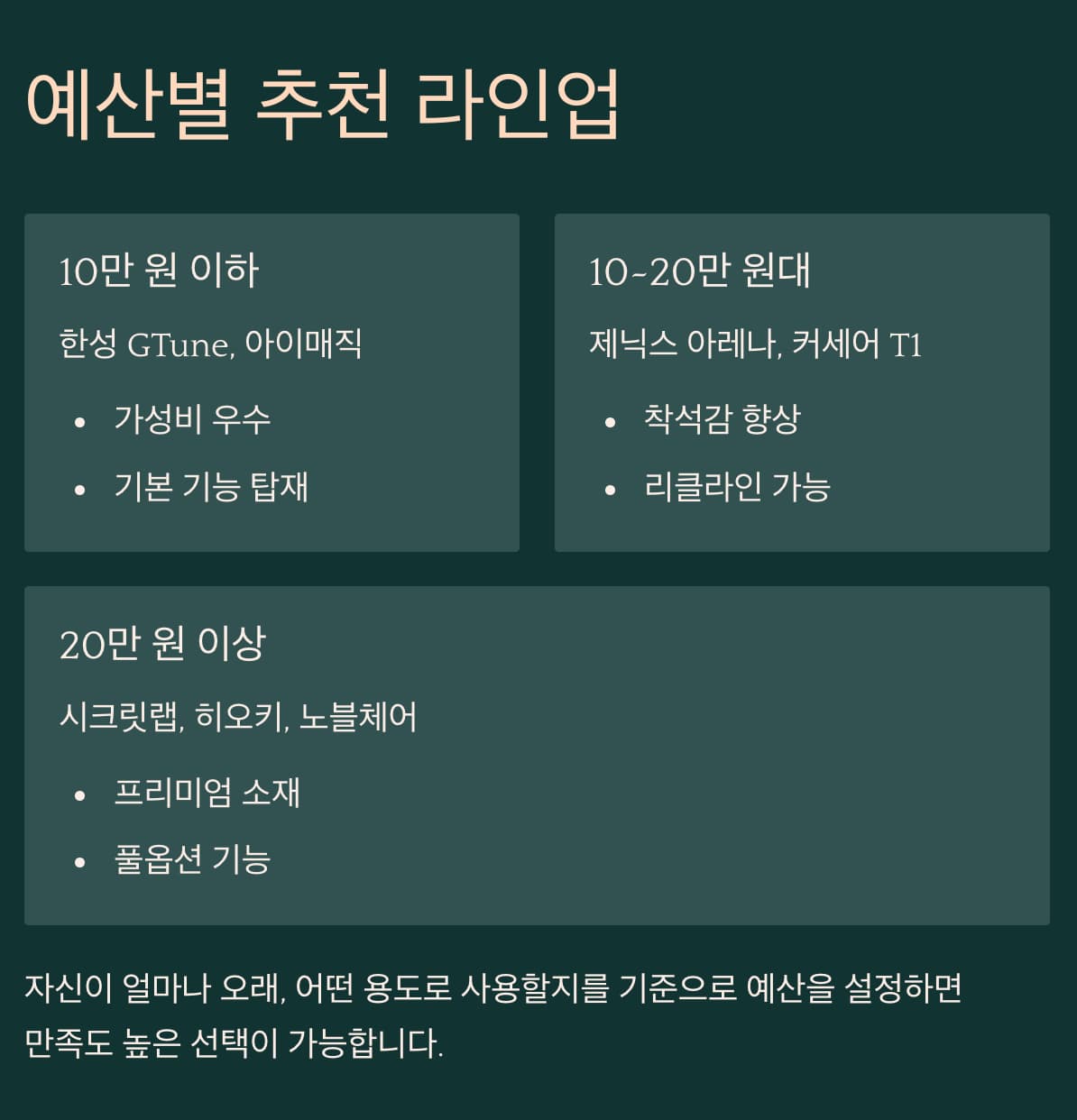 | 20만 원 이상 | 시크릿랩, 히오키, 노블체어 | 프리미엄 소재, 풀옵션 기능 |
