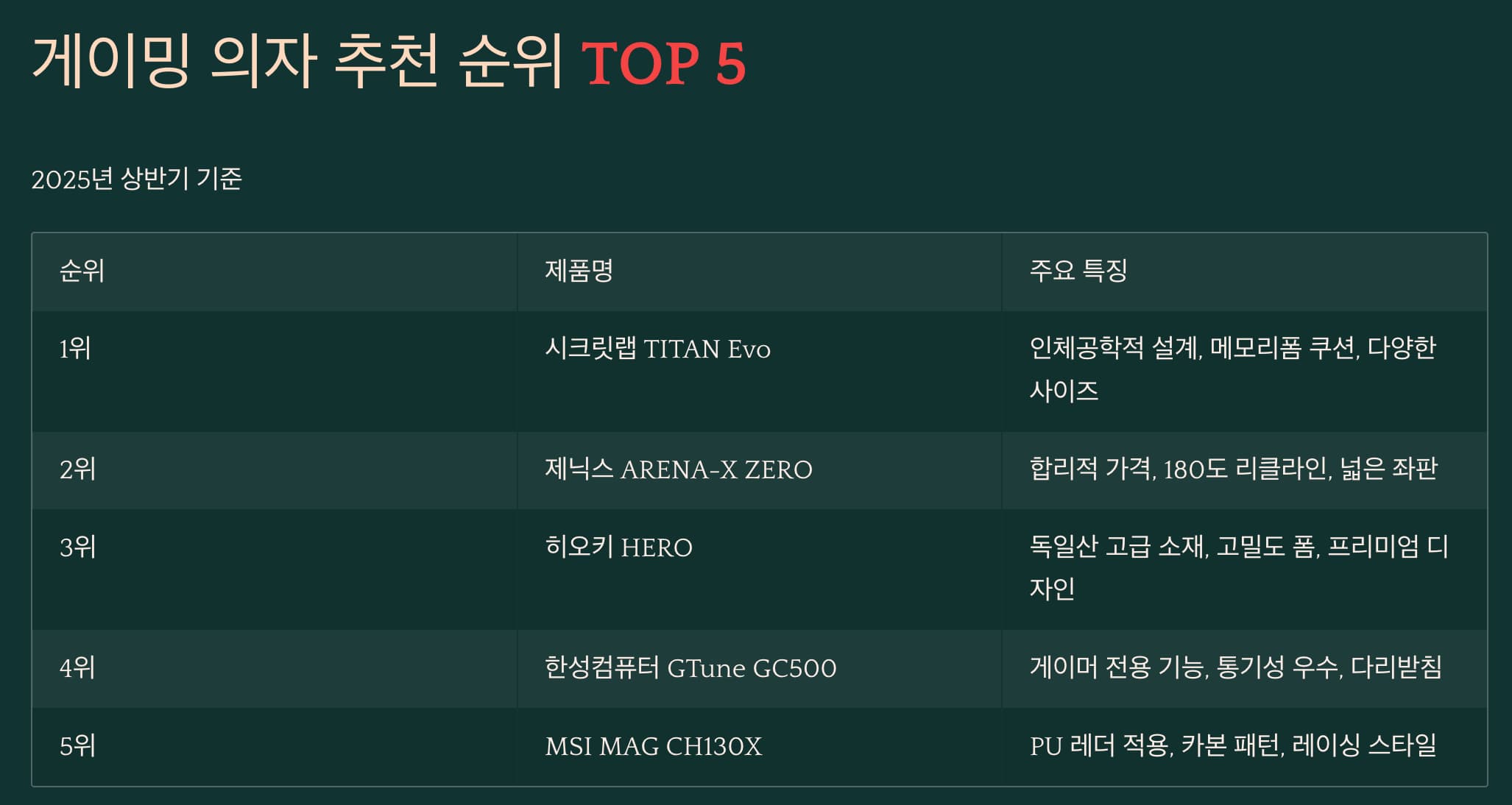 게이밍 의자 추천 순위 TOP 5 (2025년 상반기 기준)