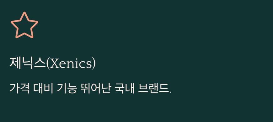 프리미엄 브랜드. 프로게이머, 스트리머 사이에서도 인기. - 제닉스(Xenics): 가격 대비 기능 뛰어난 국내 브랜드.