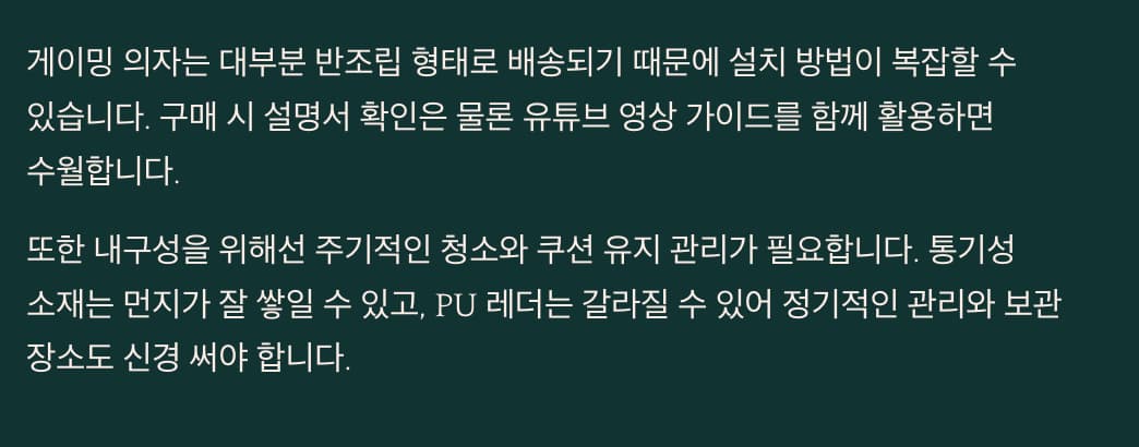 또한 내구성을 위해선 주기적인 청소와 쿠션 유지 관리가 필요합니다.