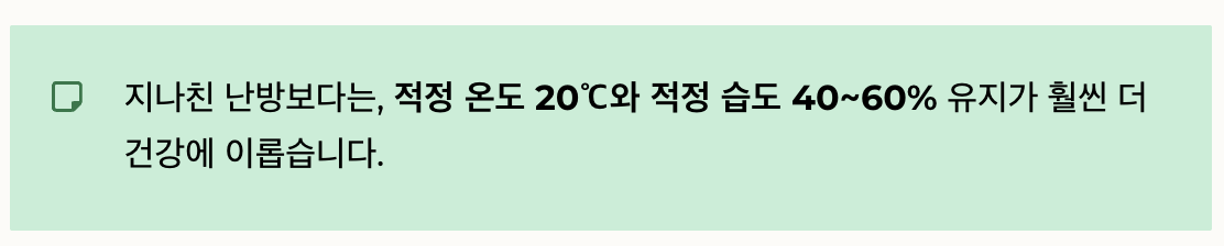 지나친 난방보다는, 적정 온도 20℃와 적정 습도 40~60% 유지가 훨씬 더 건강에 이롭습니다.