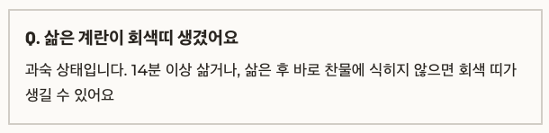 A. 과숙 상태입니다. 14분 이상 삶거나, 삶은 후 바로 찬물에 식히지 않으면 회색 띠가 생길 수 있어요
