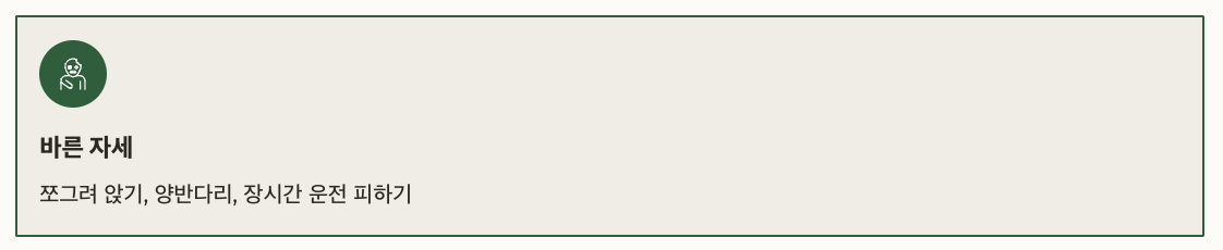 | 바른 자세 | 쪼그려 앉기, 양반다리, 장시간 운전 피하기 |