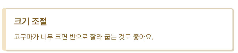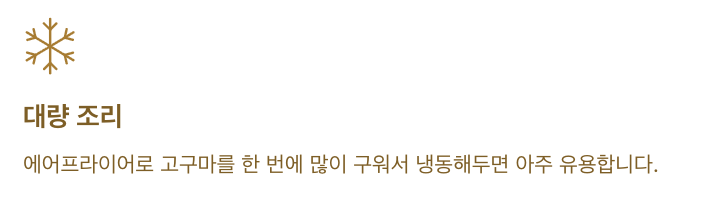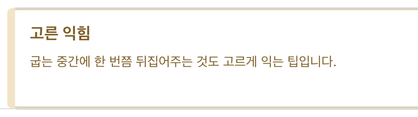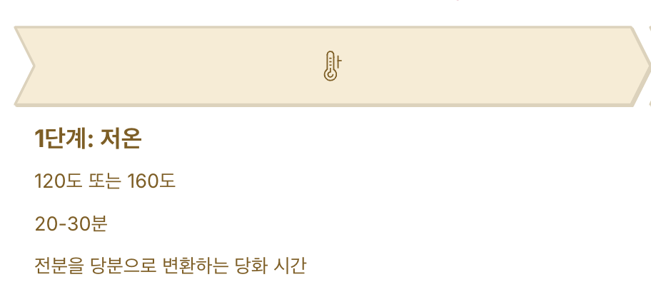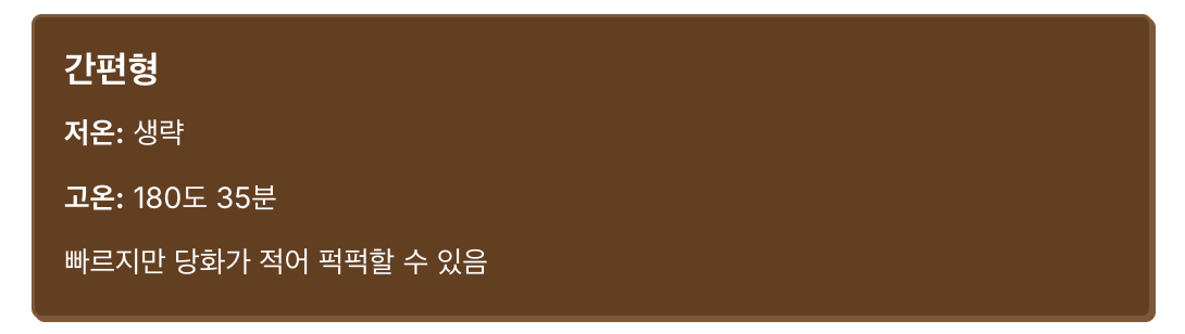 | 간편형 | 생략 | 180도 35분 | 빠르지만 당화가 적어 퍽퍽할 수 있음 |