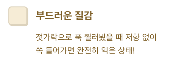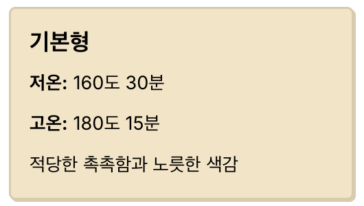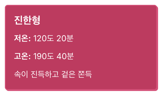 | 진한형 | 120도 20분 | 190도 40분 | 속이 진득하고 겉은 쫀득 |
