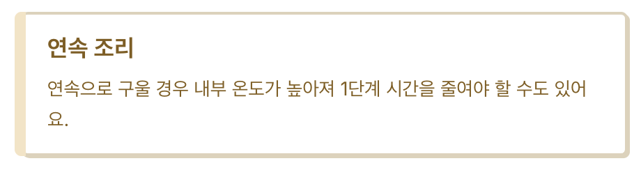 - 연속으로 구울 경우 내부 온도가 높아져 1단계 시간을 줄여야 할 수도 있어요.