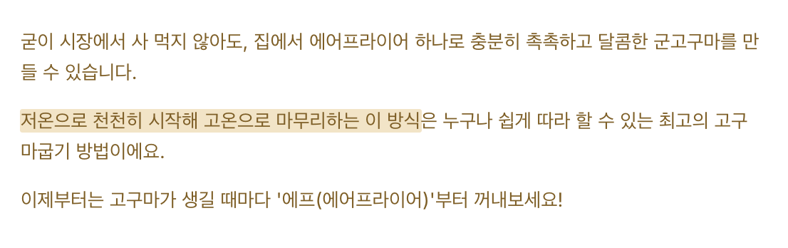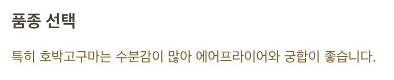 이때 고구마 안의 전분이 말토스라는 엿당으로 바뀌면서 단맛이 극대화됩니다. 특히 호박고구마는 수분감이 많아 에어프라이어와 궁합이 좋습니다.