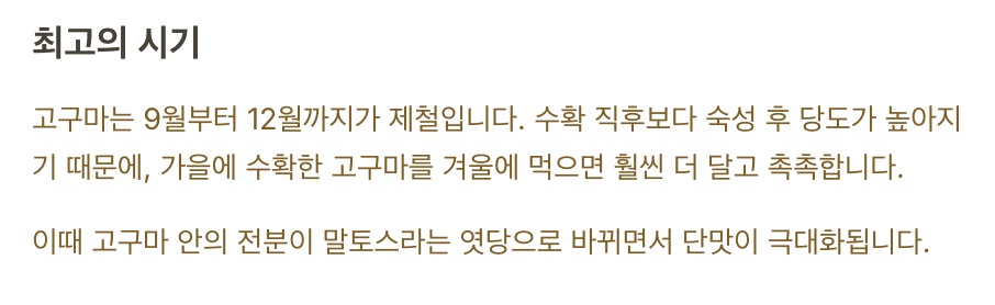 고구마는 보통 9월부터 12월까지가 제철입니다. 수확 직후보다 숙성 후 당도가 높아지기 때문에, 가을에 수확한 고구마를 겨울에 먹으면 훨씬 더 달고 촉촉하죠.